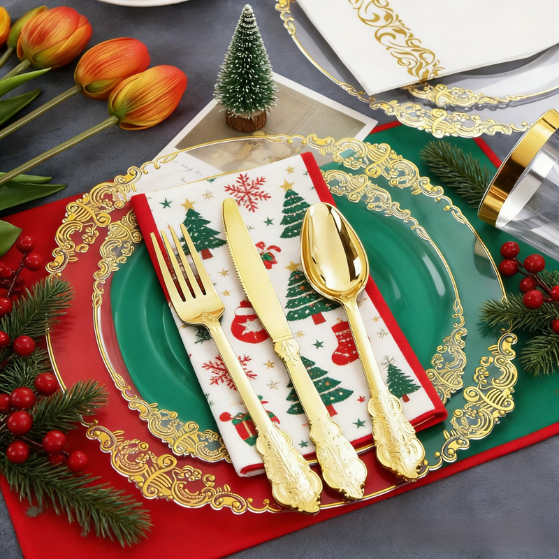 ชุดภาชนะพลาสติกสีทองสุดหรูสำหรับงานเลี้ยง 125 ชิ้น