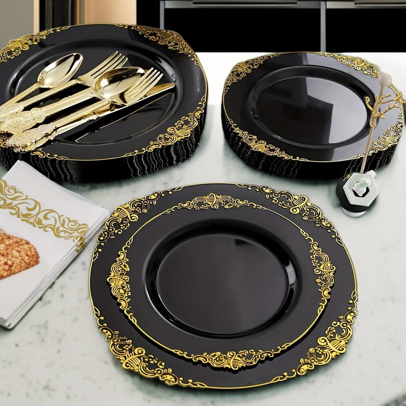 จานพลาสติกสีทองใสแบบใช้แล้วทิ้งจำนวน 125 ชิ้น - จานสีทองสำหรับ 25 ท่าน ประกอบด้วย จานอาหาร 25 ใบ จานของหวาน 25 ใบ ถ้วย 25 ใบ ส้อม 25 อัน มีด 25 อัน และช้อน 25 อัน