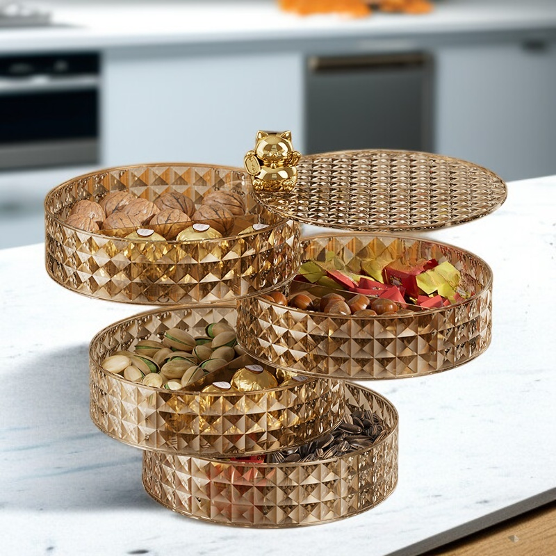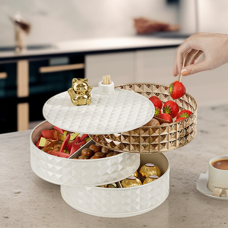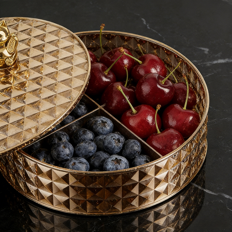 ● ถาดผลไม้หรูหราออกแบบทรงกลม เพิ่มความสวยงามให้กับห้องนั่งเล่น พร้อมใช้เป็นกล่องเก็บลูกอมและขนมได้อย่างมีระเบียบ